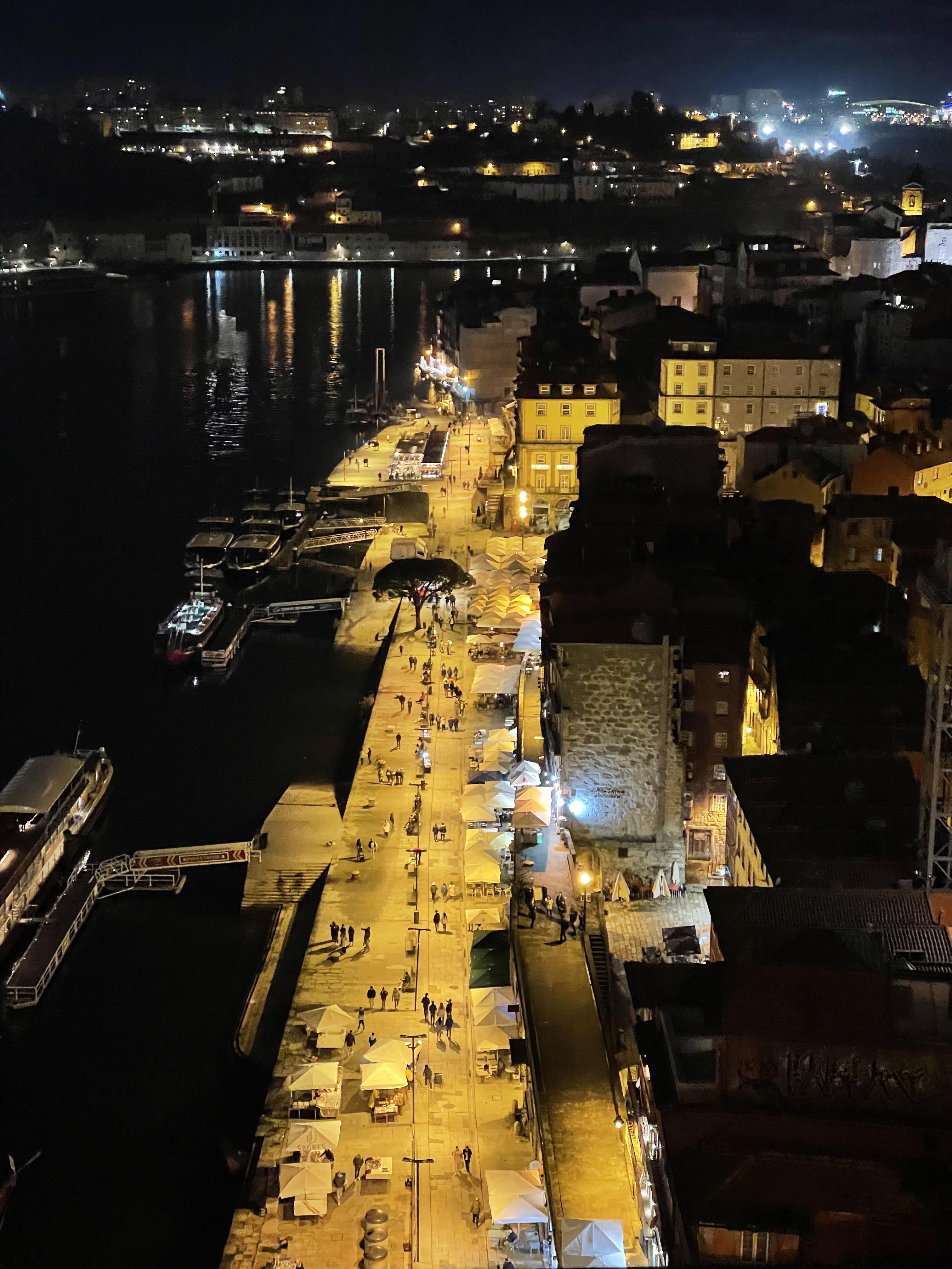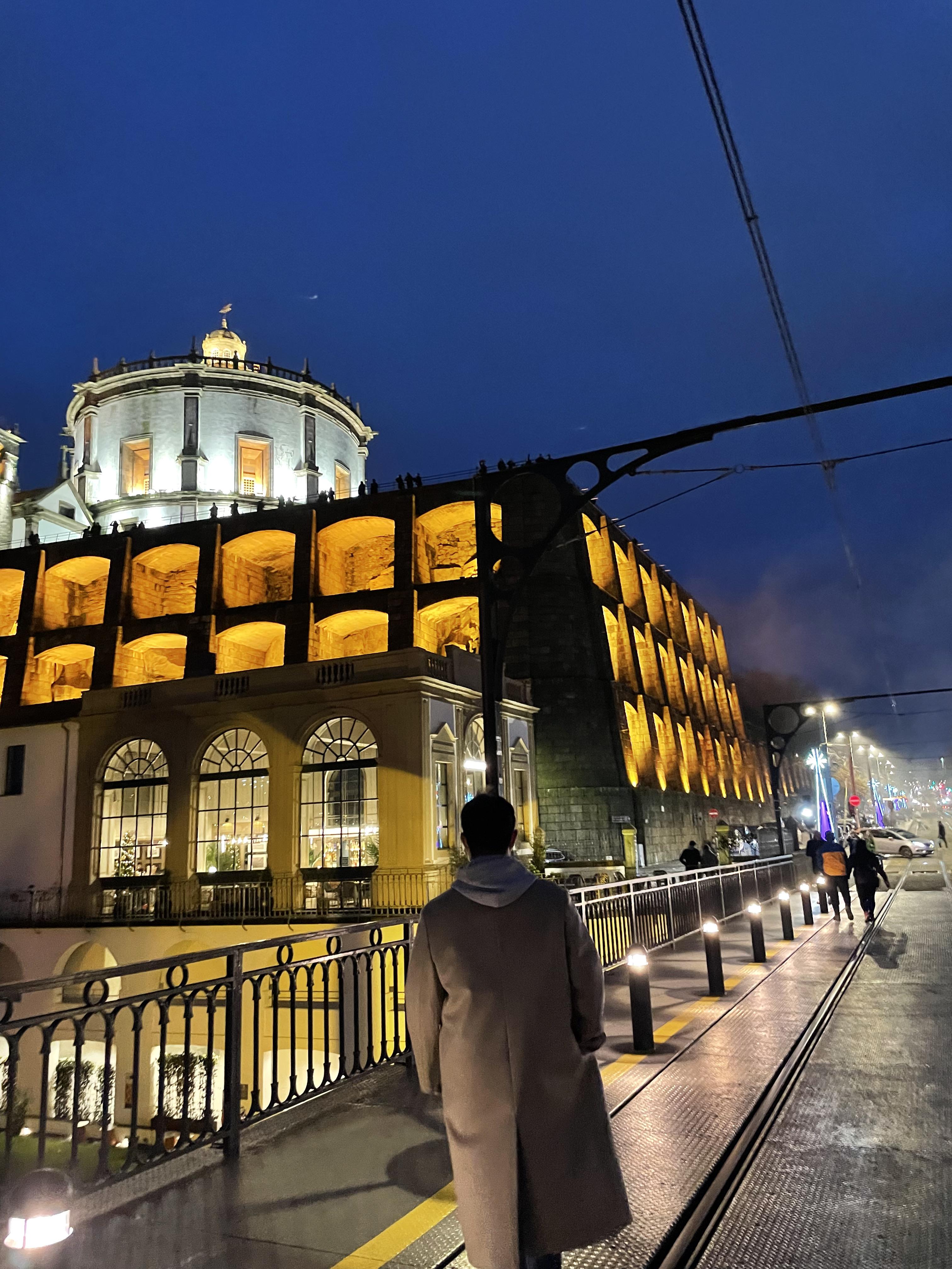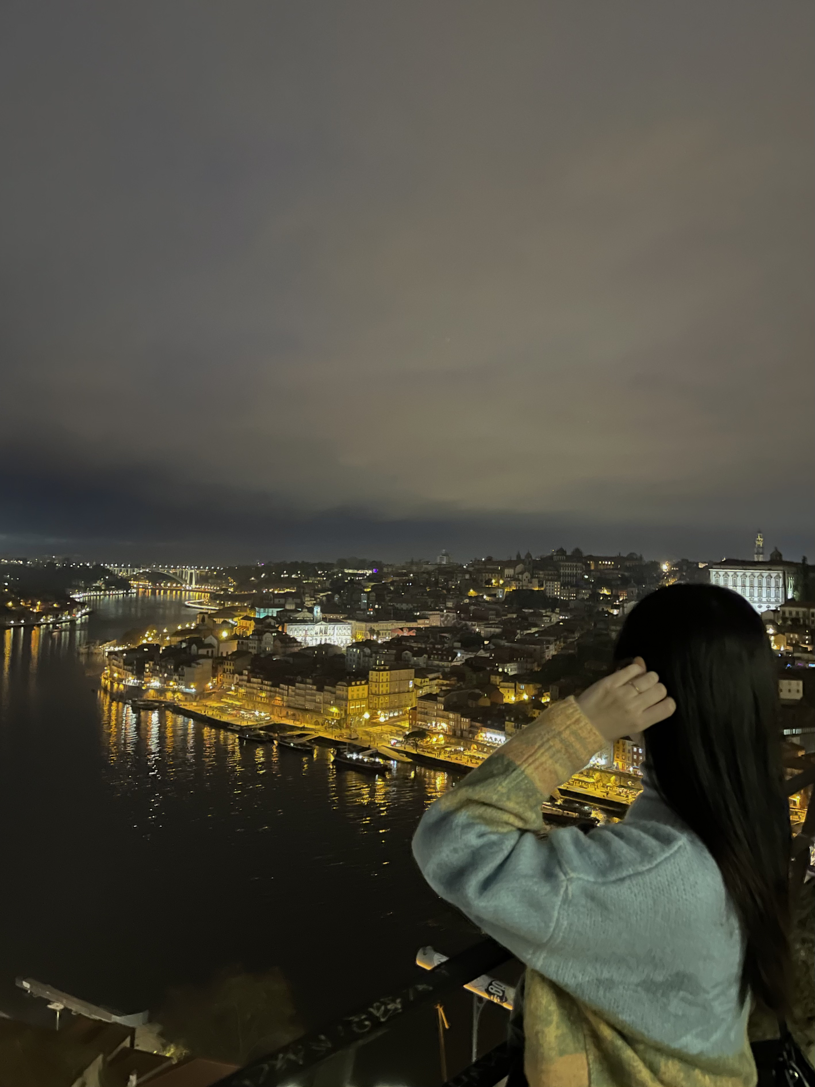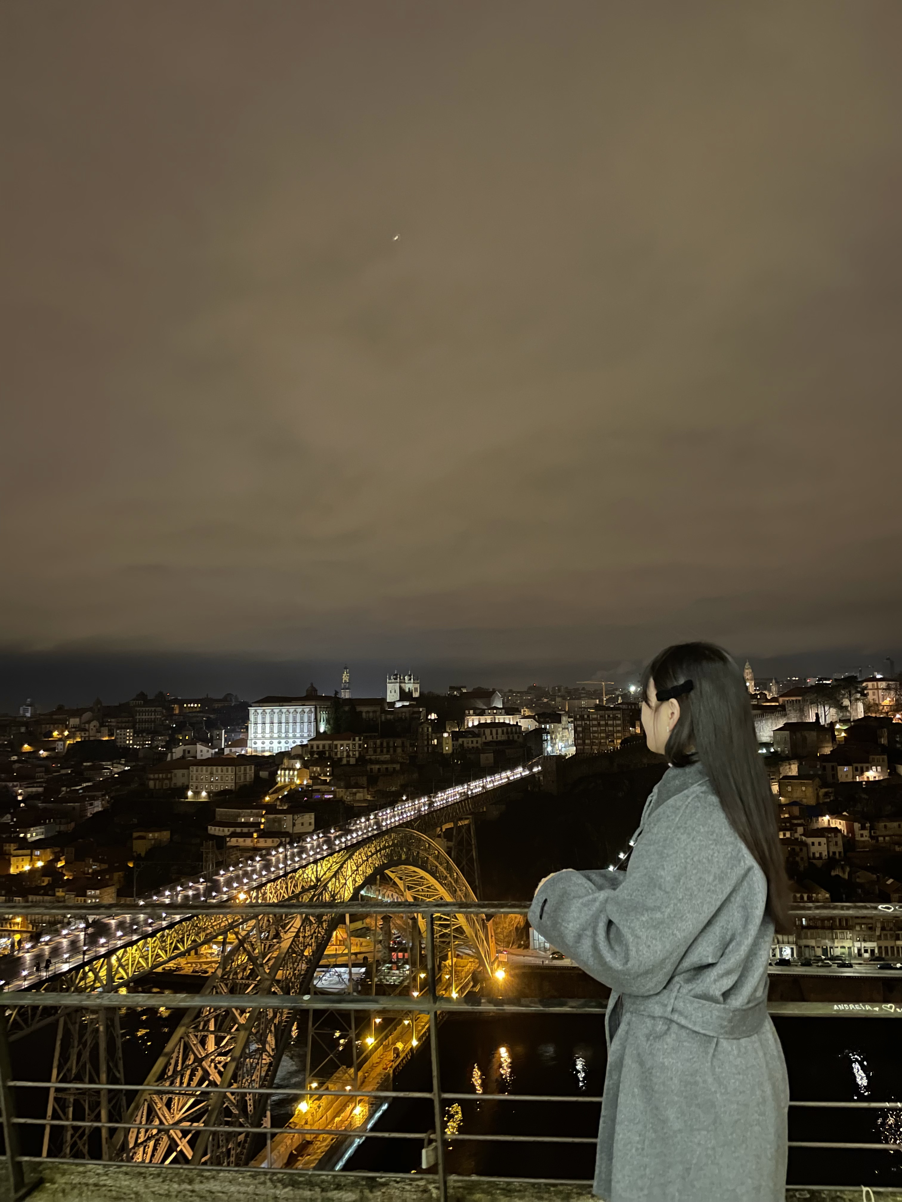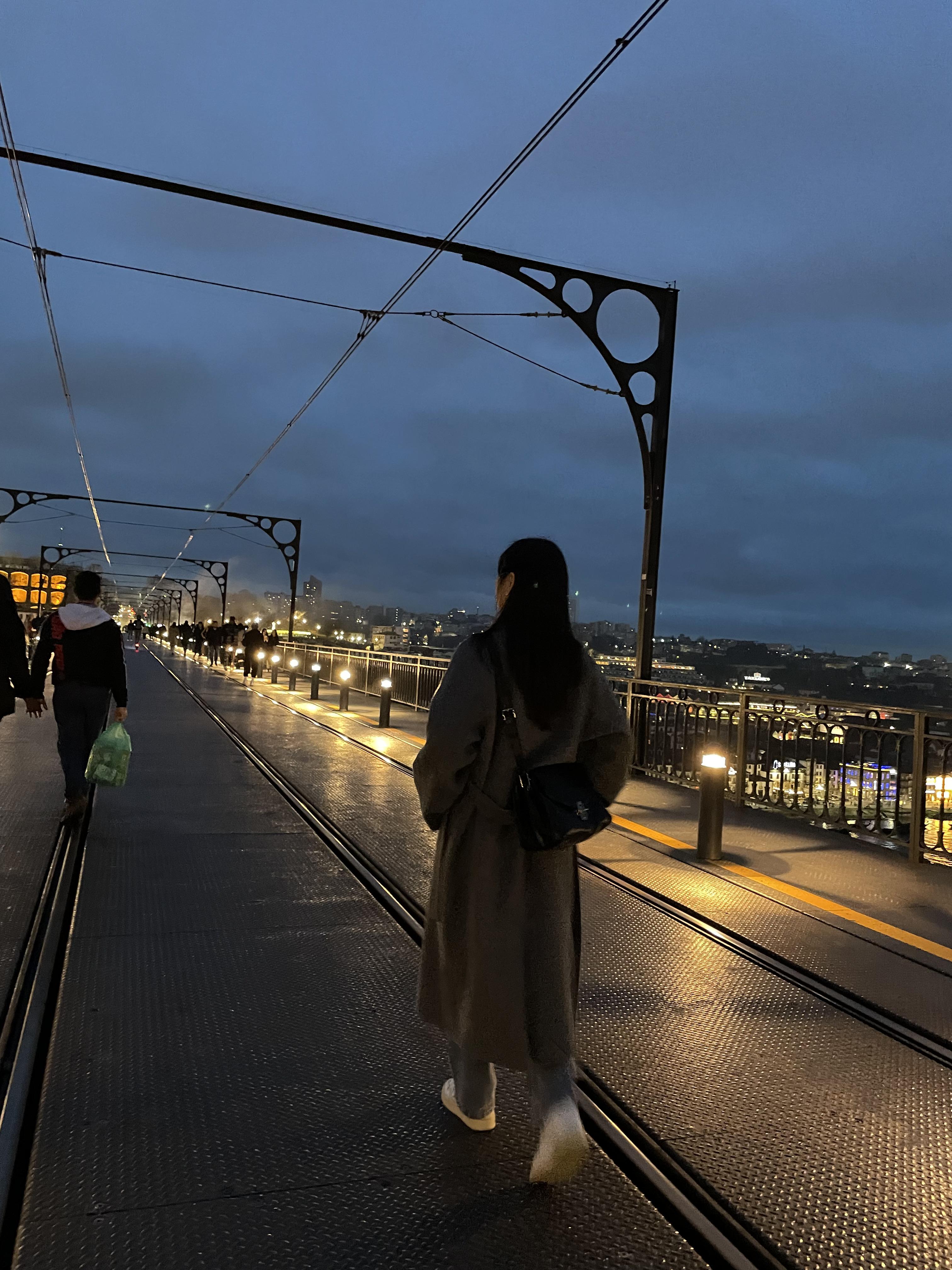 크 역시 도우루강 야경 넘 예쁘다.. 날이 흐려도 이쁘다. 오늘은 도우루 강을 건너는 동루이스 다리 2층으로 건너가 보기로 했다. 2층으로 올라가려면 푸니쿨라를 타고 올라가거나 도보로 계단을 이용해서 올라가야 했는데 하필 그냥 야경보러 나온다고 현금이 든 지갑을 안들고 나왔는데 푸니쿨라는 카드가 안된다고 해서 어쩔 수 없이 걸어서 올라갔다. 꽤 높아서 걱정했는데 생각보다는 괜찮았다(그치만 두 번은 안갈듯). 2층에 올라가니 다리를 건너는 사람들이 많았다. 사실 2층 다리는 상벤투 역쪽에서도 쭉 내려오면 바로 올 수 있는데 며칠 전에 산책하다가 와보고 너무 무서워서 못건너 갔었다. 그땐 평일이라 사람도 별로 없었는데 2층은 트램이 다니는 길이 있어서 여기로 걸어가도 되나 싶기도 했고 너무 으스스 했는데 주말에 오니까 또 다른 느낌!