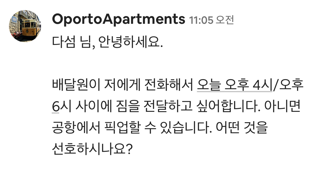어떻게 배달원이랑 연락이 됐는지 모르겠지만 배달기사랑 직접 연락해 선택지를 줬고, 오늘 받는거면 집에서 직접 받는게 좋을 것 같아서 배송받겠다고 말했다. 그리고 배달 기사가 오면 메시지 줄테니 그때 내려가서 받으면 된다고 하셨다. 진짜 묵은 체증이 내려가는 느낌이었고 호스트한테 계속계속 감사인사를 했던 것 같다.