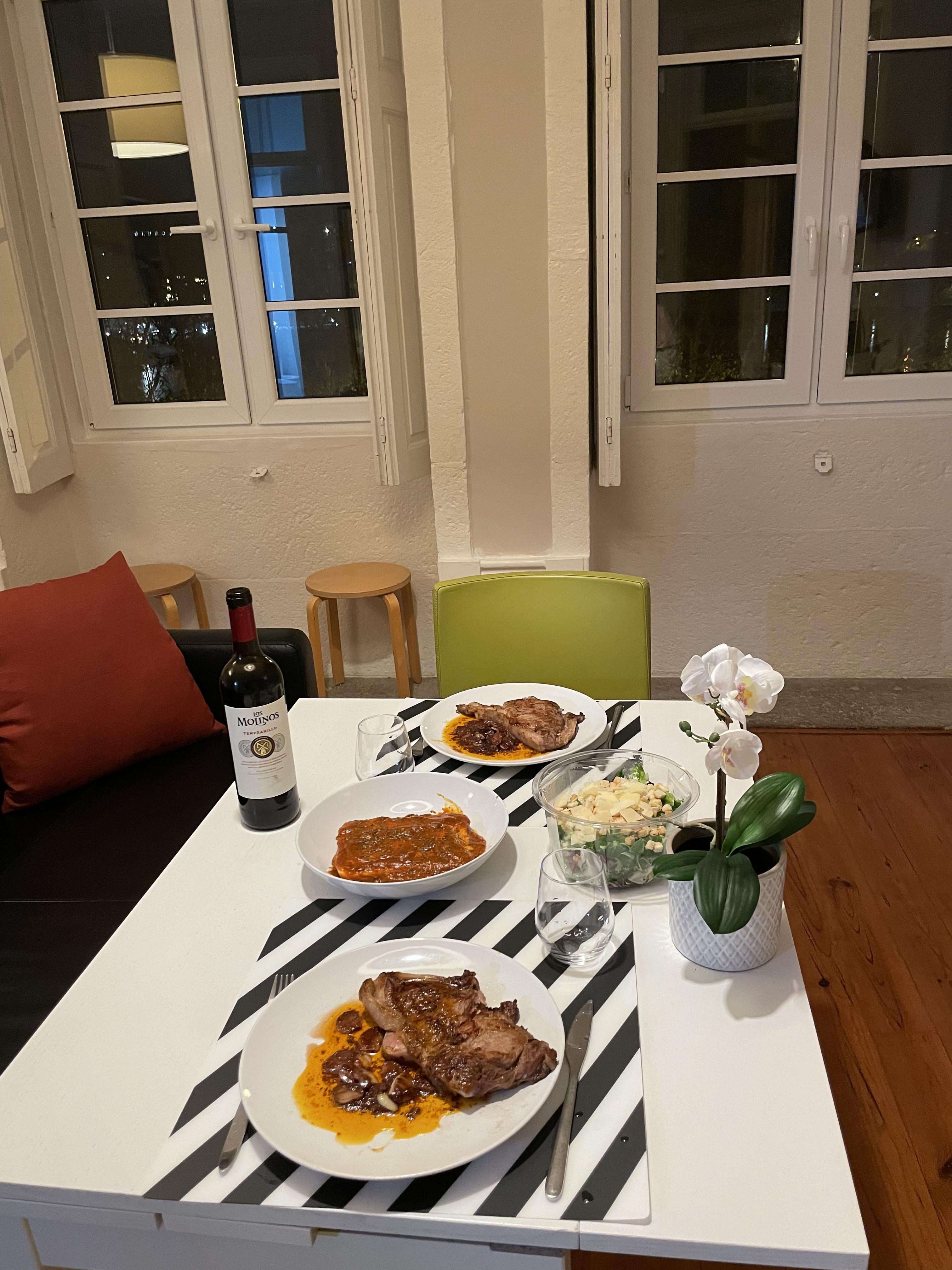 그렇게 야경 실컷 보고 숙소 돌아와서 아까 장봐 온 것들로 능길이가 저녁을 차려줬다. 직접 구운 스테이크와 냉동라자냐, 샐러드. 마트에서 처음보는 식재료들로 어떻게 뚝딱뚝딱 잘하는 지 신기하다. 고기는 우리가 평소 먹던 스테이크 부위랑 좀 다르긴 했지만 그래도 입맛에 맞는 음식을 오랜만에 먹으니 너무 맛있었다.