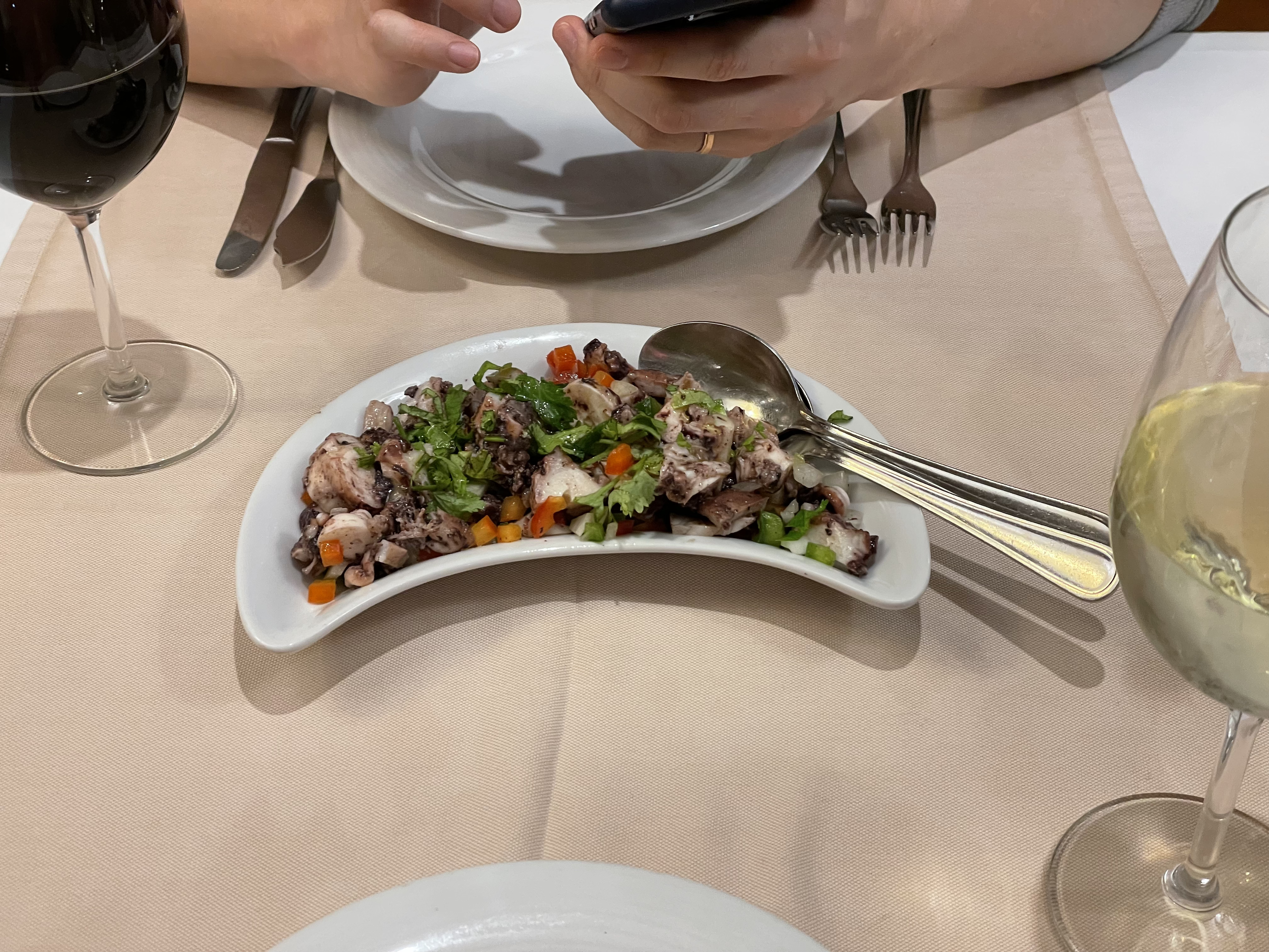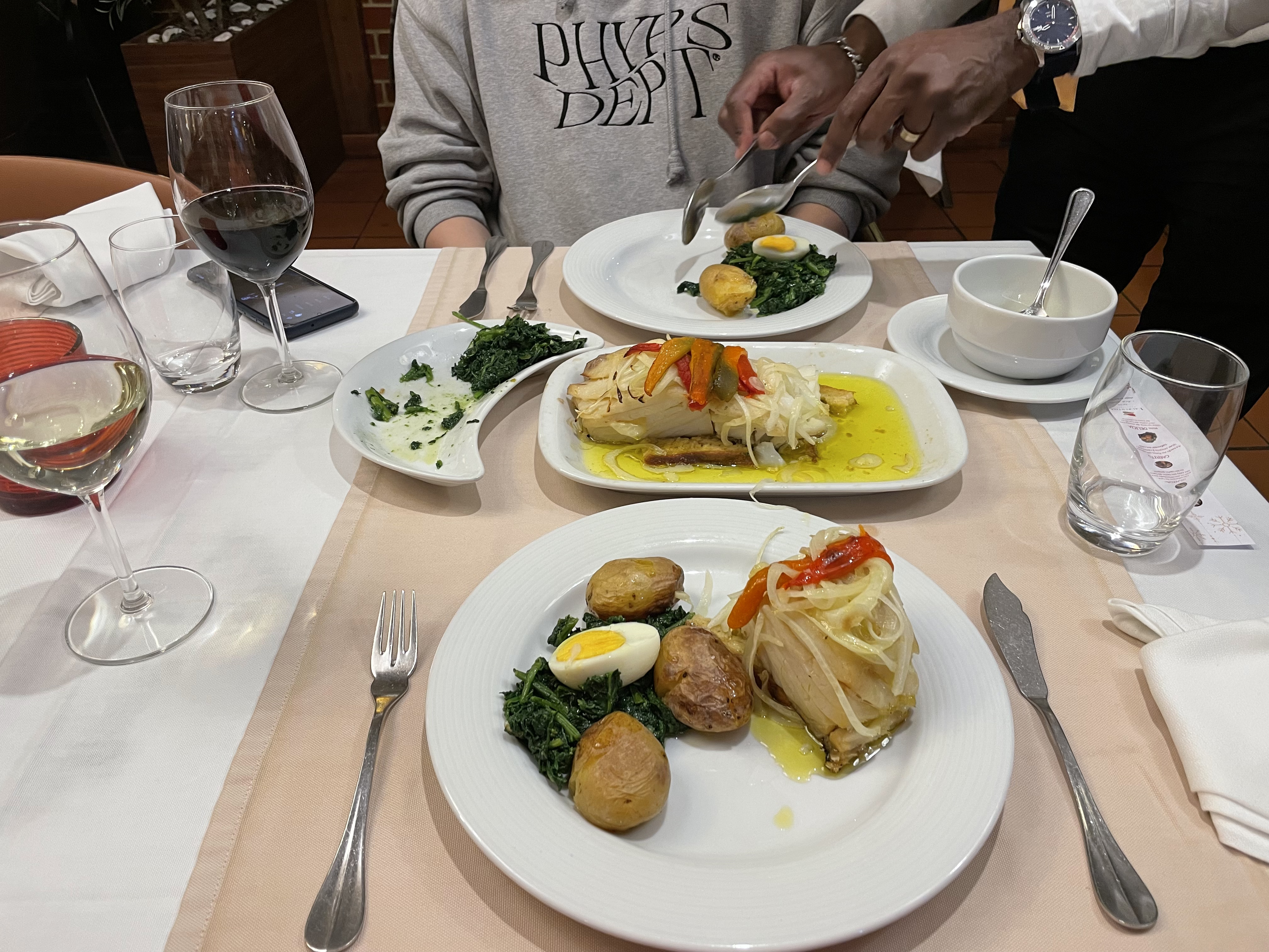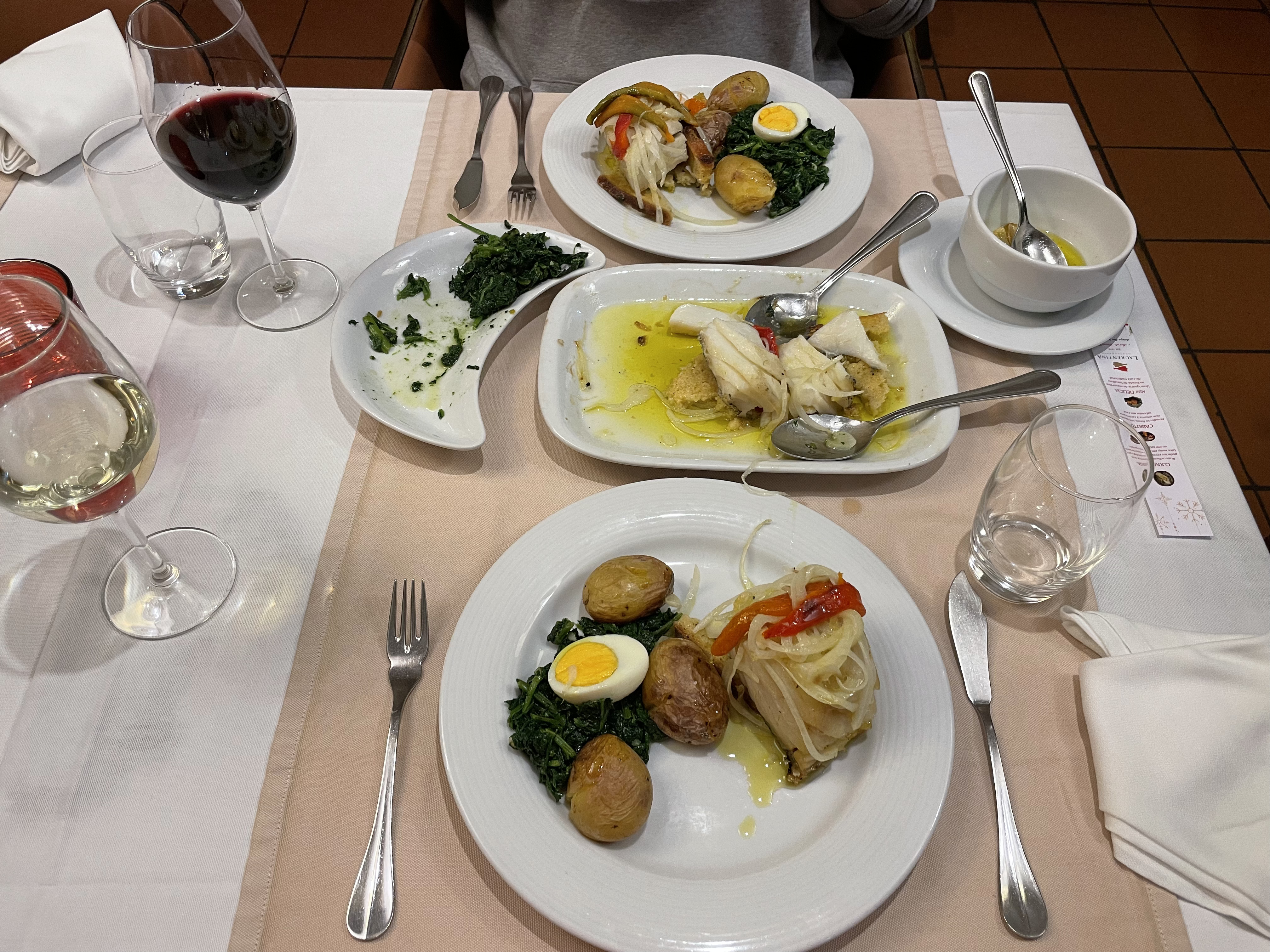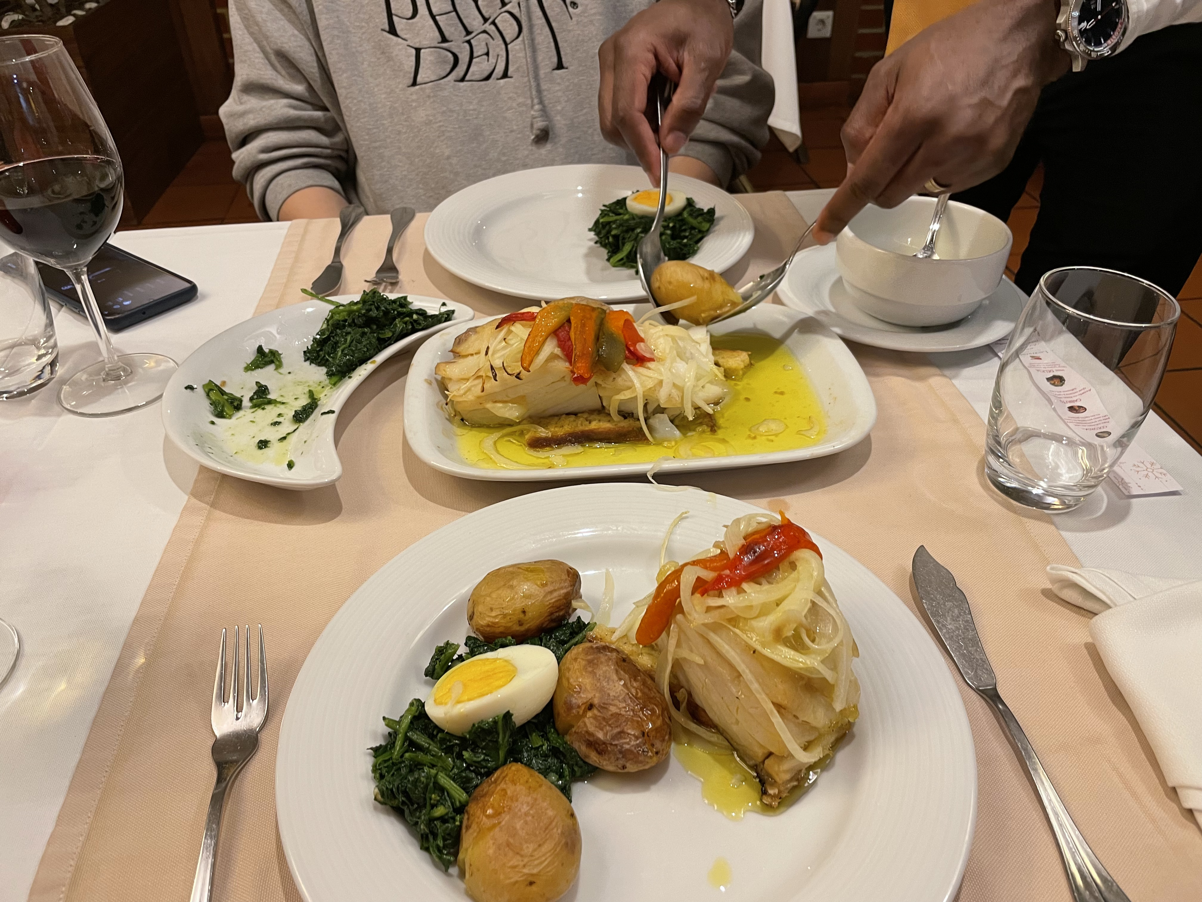 에피타이저로 문어샐러드를 시켰는데 고수 빼달라고하는 걸 까먹었다. 그래도 탱글쫄깃상큼해서 그린와인이랑 잘 어울렸다. 메인은 여기가 바칼라우 리뷰가 너무 좋길래 오늘도 바칼라우로 시켜보았다. 다른 곳과 달리 시금치같은 사이드와 오일이 담긴 그릇이 같이 나왔는데 웨이터에게 어떻게 먹는 지 물어봤더니 잠깐 설명하시더니 직접 해드려도 되겠냐고 여쭤보시고 내 그릇에 먼저 셋팅을 해주셨다.